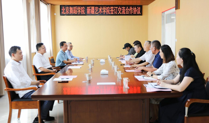 章立新书记代表学校对巴图书记一行的来访表示热烈欢迎,对北京舞蹈学院长期以来在我校师资队伍建设、人才培养及创作实践等方面给予的专业指导表示感谢,就双方以建设“丝绸之路经济带”为契机强化合作交流进行了展望。他表示,双方要围绕优势资源,以人才培养、艺术实践、剧目创制、科学研究、文化传承与创新、对外合作与交流等为核心,共同推动舞蹈教育事业繁荣发展。巴图书记回顾了两校良好的交流合作历史,表示新疆具有丰富的文化艺术资源尤其是舞蹈资源,是艺术家采风实践创作的宝地,将继续加强在学科专业建设、科研学术交流、教师和人才队伍建设等方面的工作,优势互补,合作共建。双方就相关合作项目达成一致意见,并签订战略合作协议书。