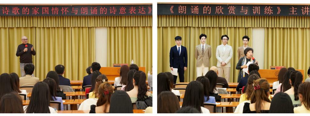 欧震以《诗歌的家国情怀与朗诵的诗意表达》为题,从古典诗词的爱国传统讲到现当代诗歌的使命担当,在解析诗歌《青春中国》时,他说:“朗诵者要像诗人一样,用声音传递赤诚,用每一行诗句表达对土地的深深热爱。”王静以《朗诵的欣赏与训练》为题,围绕“朗诵的审美与实践”,从“气息控制”“情感投射”“舞台表现力”三个方面进行讲解,通过对比不同风格的朗诵片段,生动阐释了“技术为表、情感为里”的艺术理念。