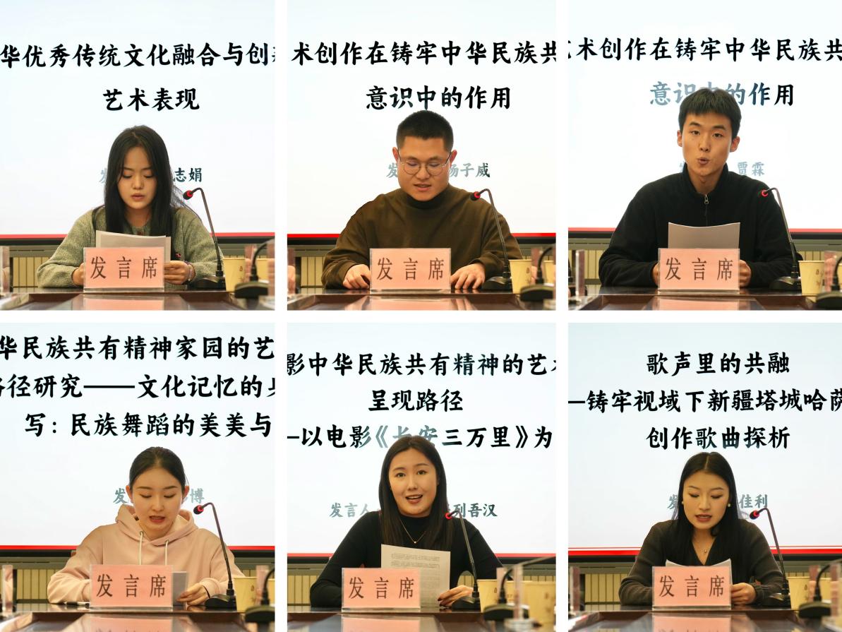 与会师生从“中华民族共有精神家园的艺术呈现路径”“艺术创作在铸牢中华民族共同体意识中的作用”“中华优秀传统文化融合与创新的艺术表现”“中华文化符号和形象”等方面,结合所学专业进行交流发言,专家分别进行了点评。