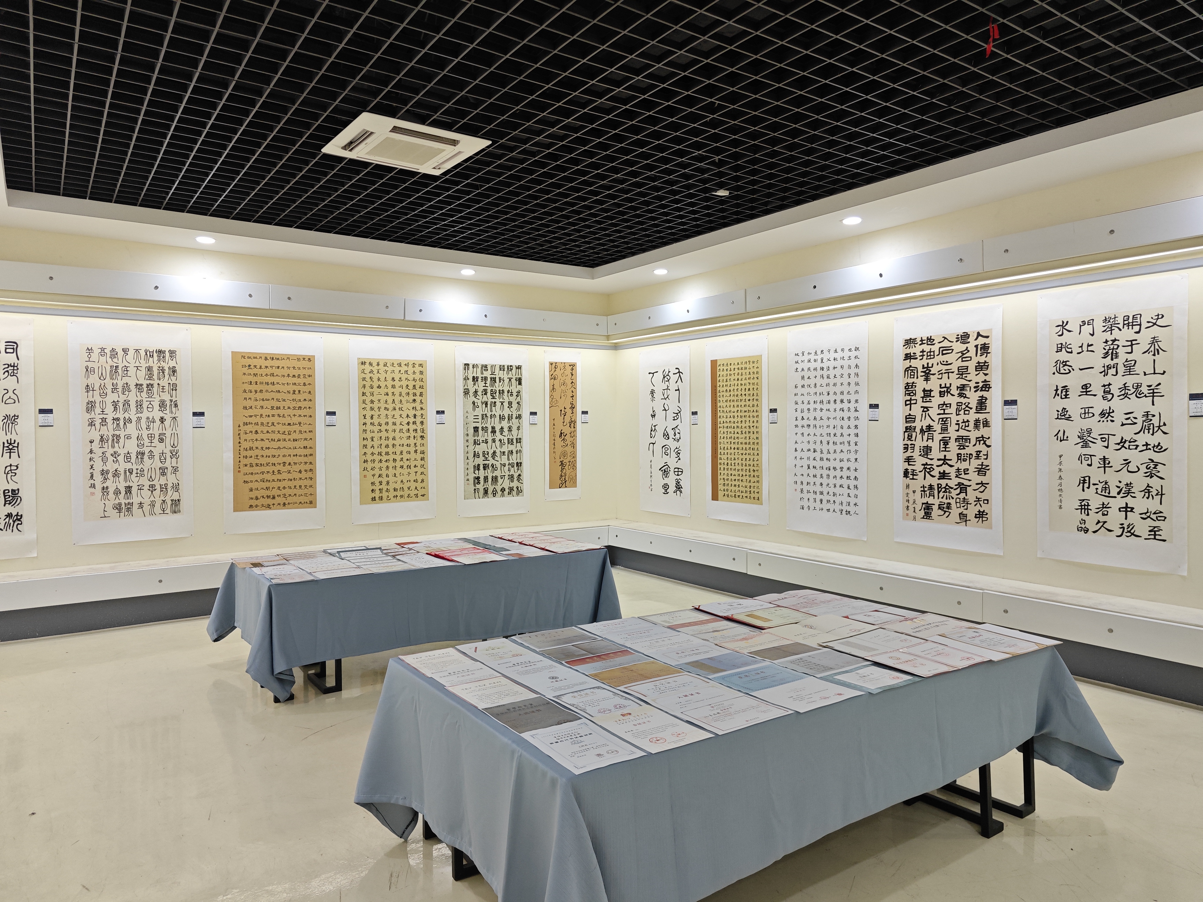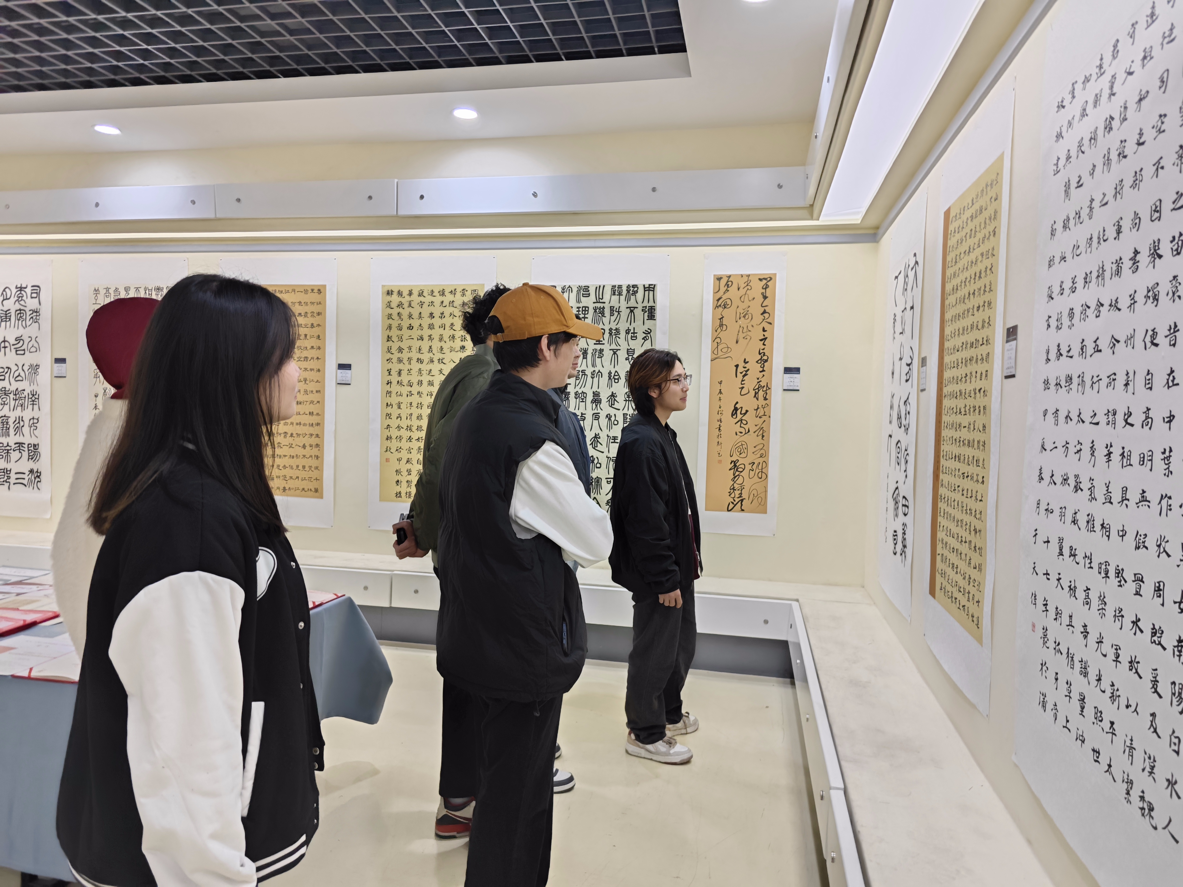书法教学成果汇报展展出了篆、隶、楷、草、行等各种书体的作品74件,形式多样,风格各异。作品或笔法严谨,端庄秀丽;或气势磅礴,豪放洒脱;或灵动飘逸,充满诗意。既有传统书法样式,也有专业特色作品与创新作品,从中可以看到墨色如瀑、挥洒自如的豪情,也可以领略到线条如丝、婉约柔美的韵味。