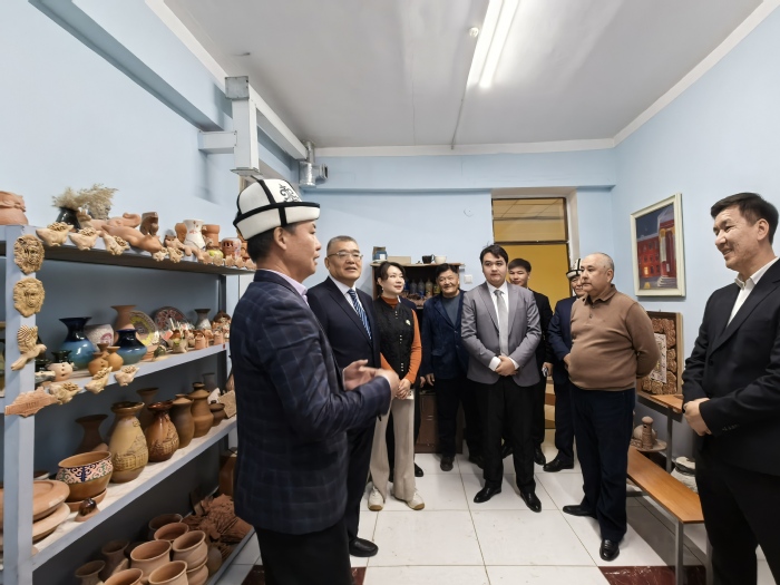 会后“丝路行”团组参观了奥什国立大学艺术学院、孔子学院、手风琴博物馆和陶艺制作室等,观赏设计作品,现场聆听音乐会,并与奥什国立大学师生进行了友好交流。
