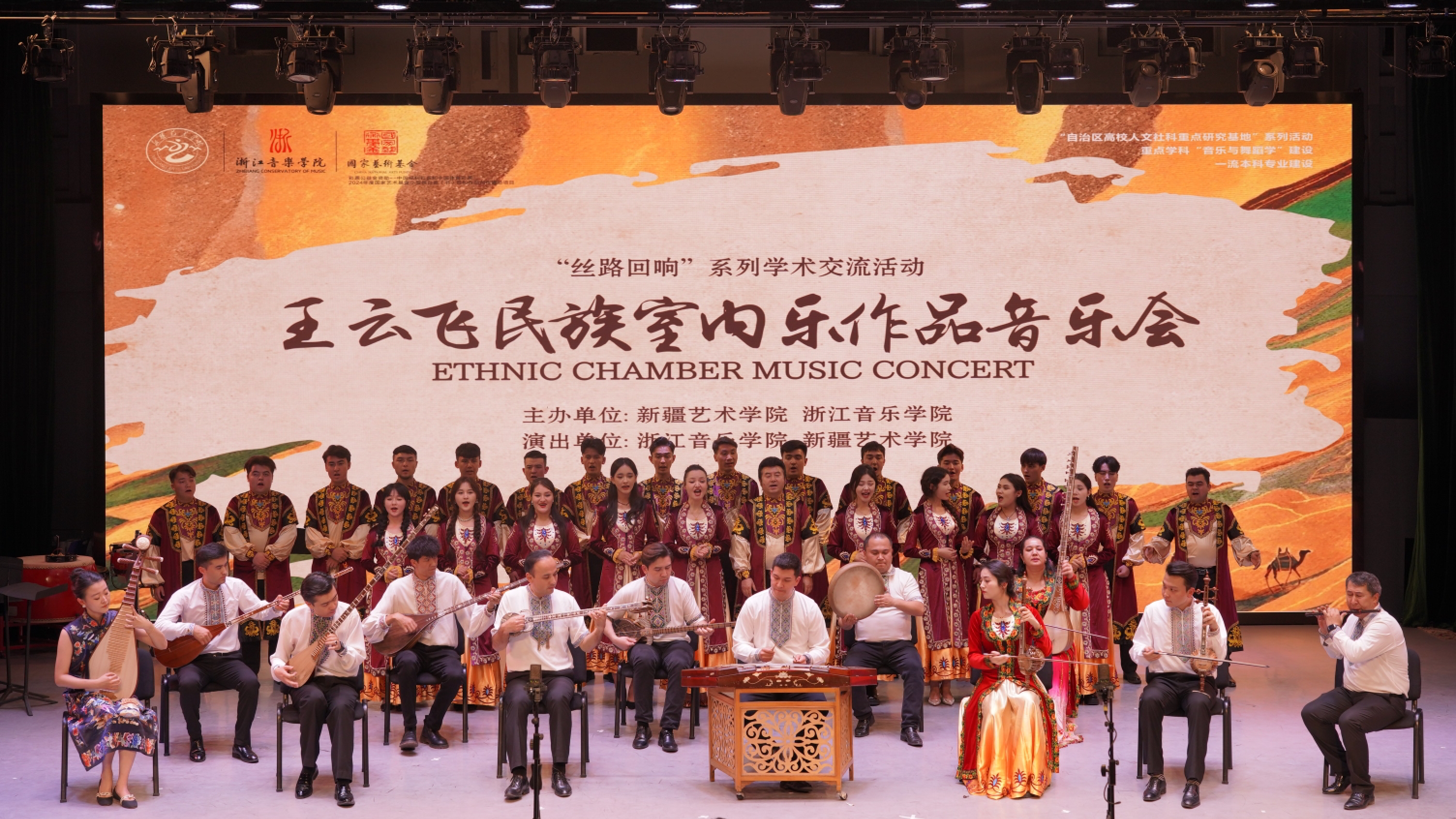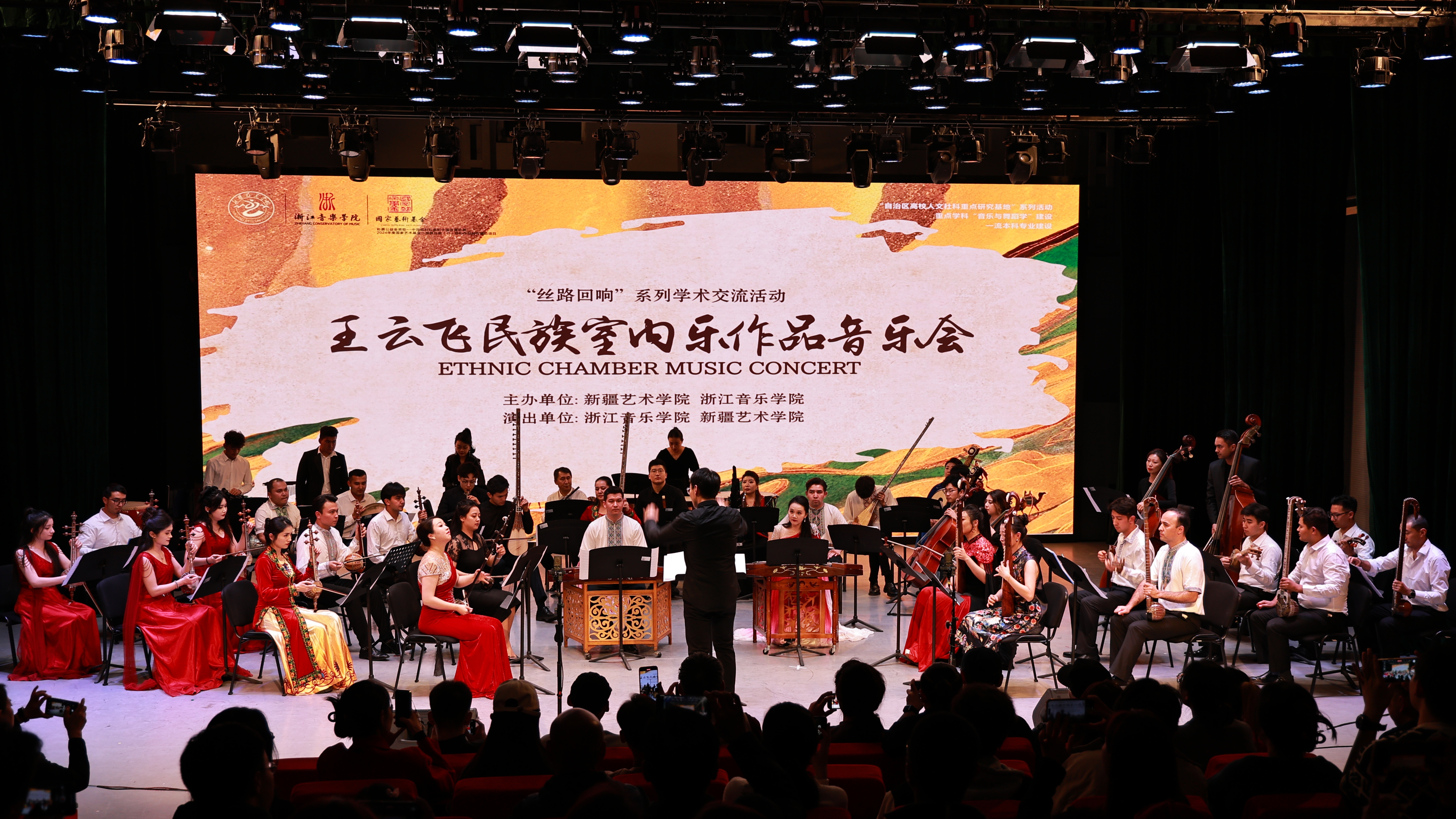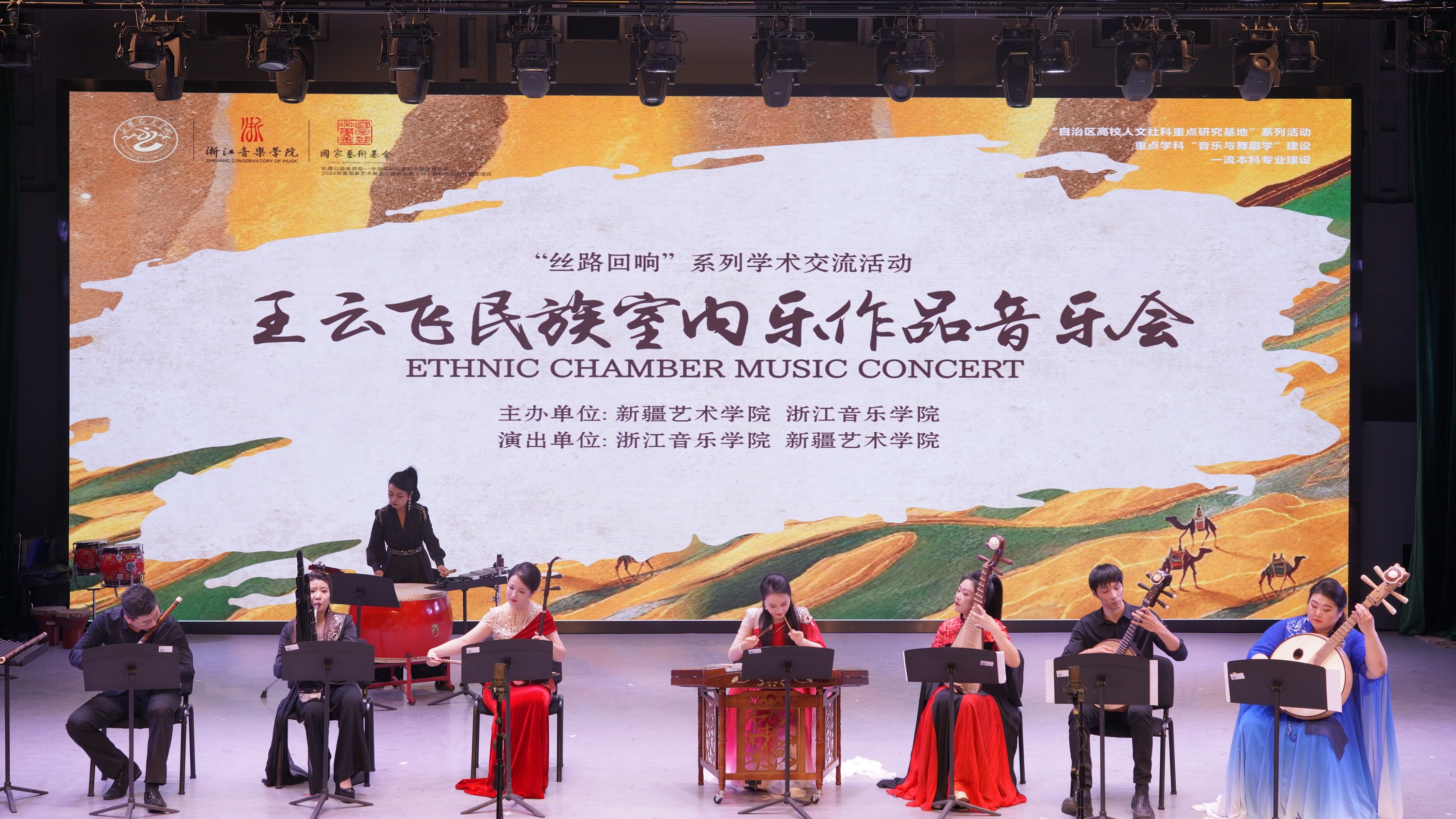 音乐会在婉转悠扬的民族室内乐作品《紫竹》中拉开序幕。两校教师共同演奏《楼兰意象》,独特的旋律和节奏带领现场观众走进了美丽、繁荣而神秘的楼兰古城。随后,浙江音乐学院教师团队演奏了由王云飞教授创作的五首室内乐作品《弦之声》《巾帼》《天际》《十里红妆》《莫干》,这些作品题材丰富、风格多样,蕴含了深厚的艺术底蕴和精神内涵。音乐会后半场,我校师生演奏了《丰收》《昆仑之春》《且比亚特木卡姆》片段(朱拉)三首新疆风格的经典作品,展现了新疆独特的民间艺术魅力和深厚的文化底蕴。音乐会在两校师生共同演奏的民乐合奏作品《舞动丝路》中落下帷幕。