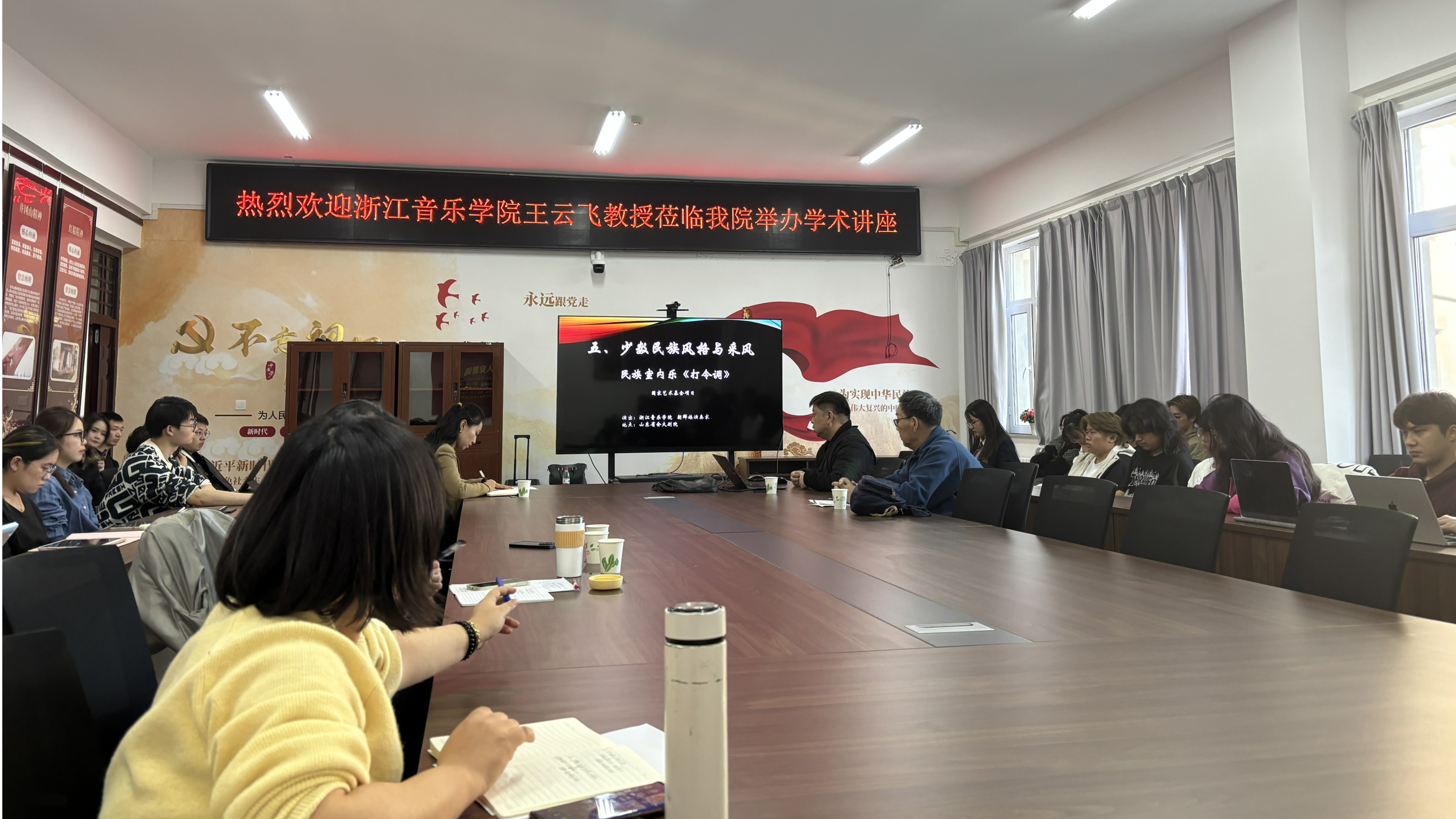 座谈会上,两校音乐教师团队围绕人才队伍、学科专业、科研创作等方面进行深入交流研讨。随后,浙江音乐学院教授王云飞作了题为《漫谈我的民族器乐作品及创作之感》的专题讲座,从题材选择、画面描绘、情感表达、创作采风、可听性与技术性、中国风格与中国文化等六个方面进行详细讲解。
