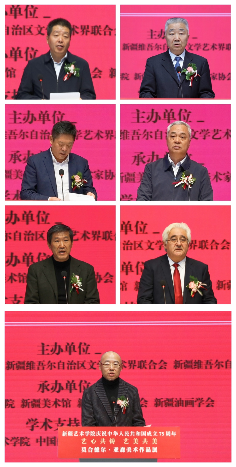 自治区人民政府副秘书长崔劲松,自治区党委教育工委专职副书记张士民,自治区文化和旅游厅副厅长马旭国出席并致辞,中国美协副主席、新疆文联副主席、美协主席郐振明,中央美术学院教授袁元宣读贺信。新疆艺术学院党委书记章立新出席并致欢迎辞,学院党委副书记、院长莫合德尔·亚森致感谢辞,学院党委常委、副院长全立新主持了开幕式。