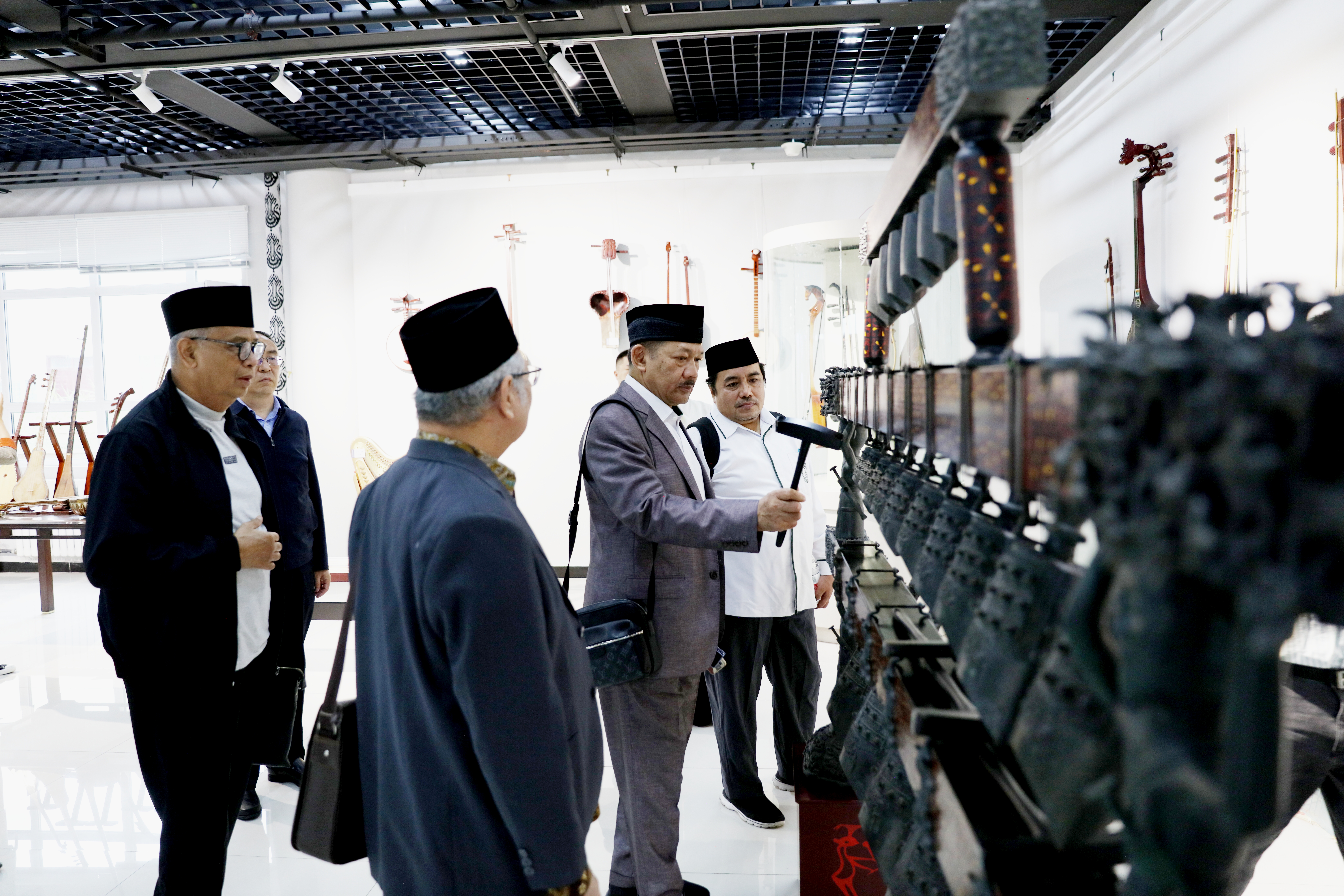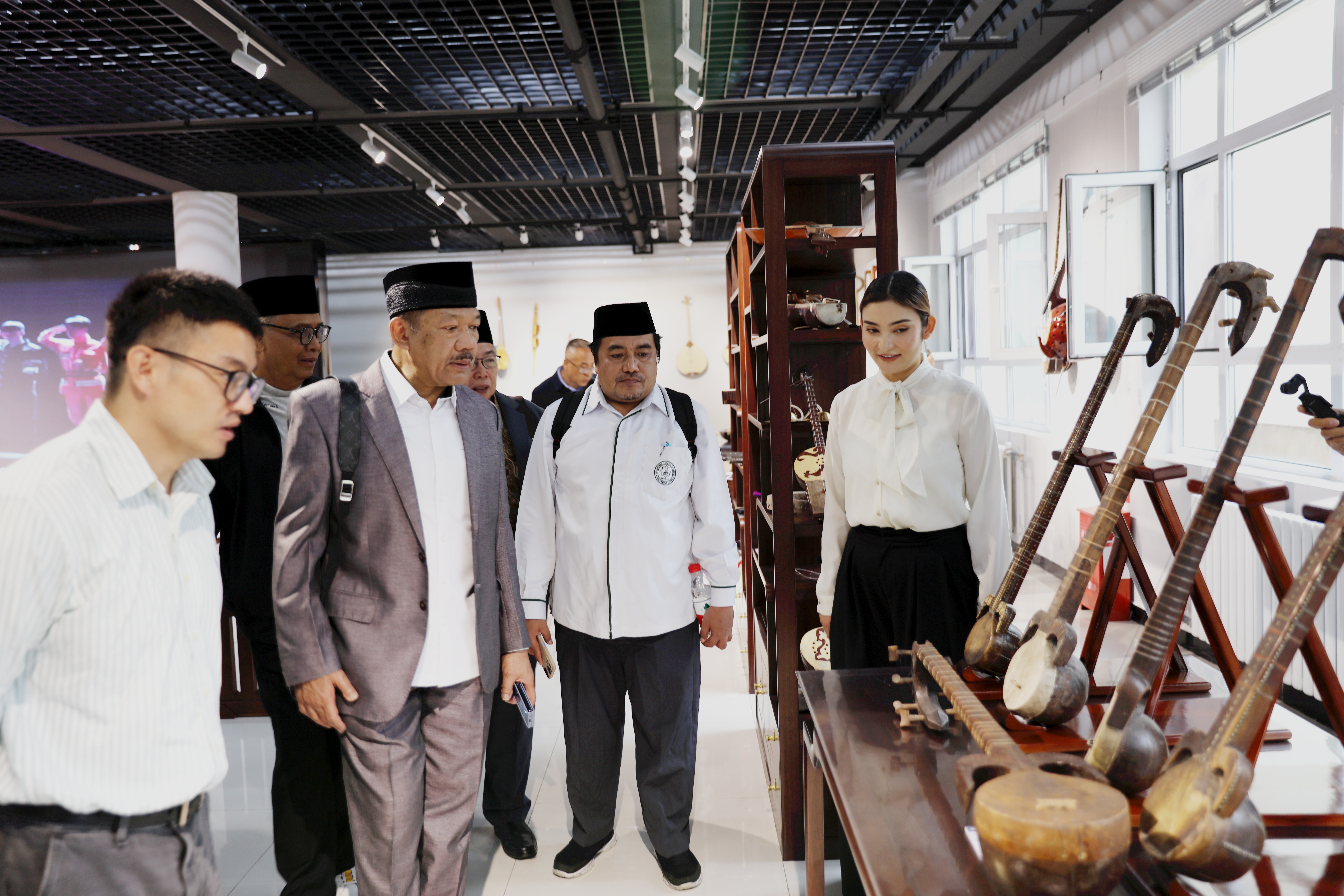 参访团一行参观了学校万桐书木卡姆文献馆、中华传统乐器馆等文化场馆。在万桐书木卡姆文献馆,参访团深入了解到中国政府为保护传承少数民族文化艺术作出的努力和取得的成就,以及万桐书等老一辈音乐家抢救木卡姆艺术的感人事迹。