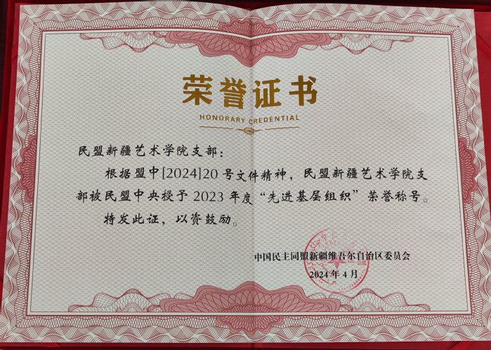 近日,中国民主同盟中央委员会公布了《民盟中央关于表彰组织工作先进集体的决定》《民盟中央关于表彰思想政治建设和宣传工作先进集体和先进个人的决定》,民盟新疆艺术学院支部获得了民盟中央2023年度“先进基层组织”和“民盟思想政治建设和宣传工作先进集体”荣誉称号。