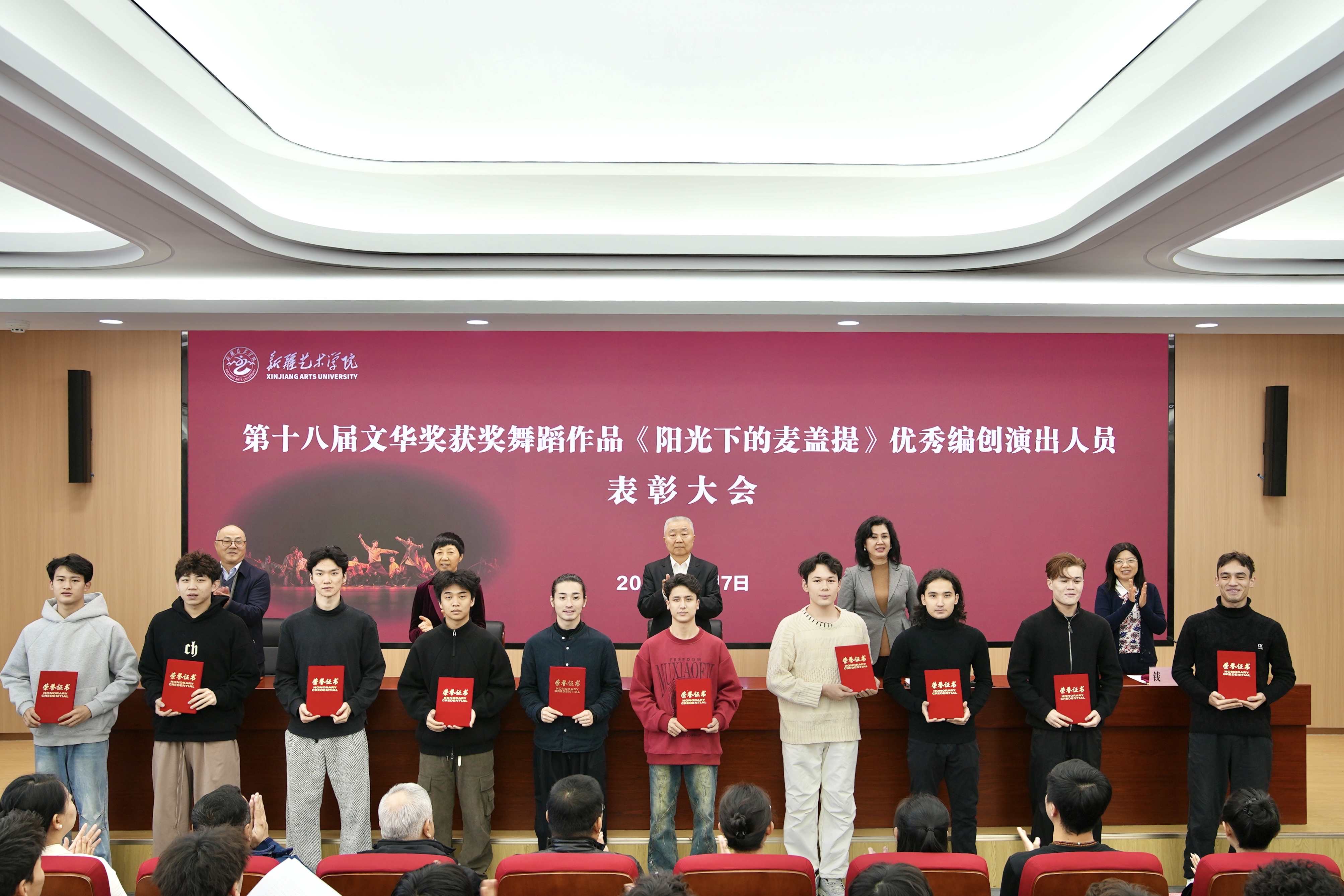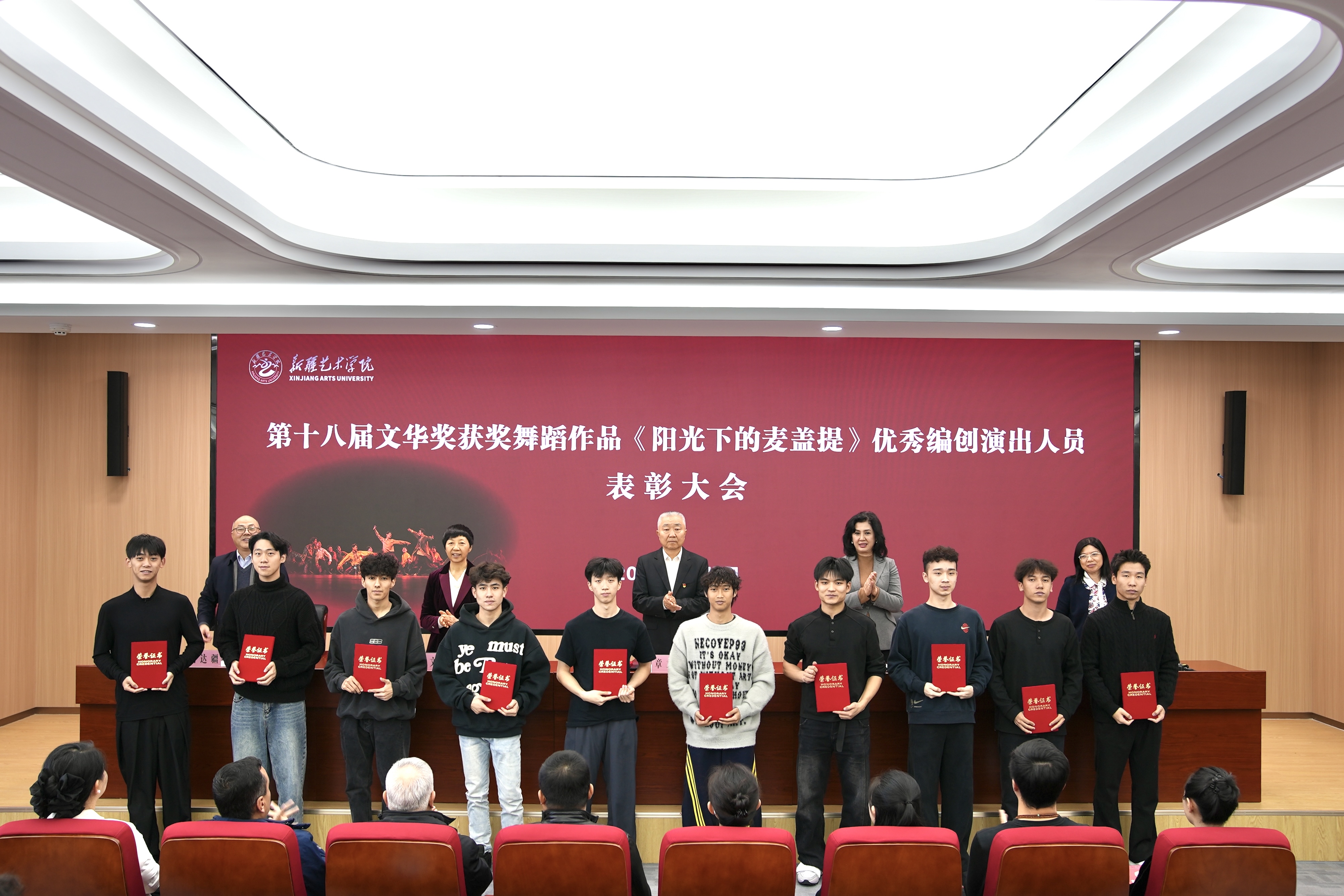 会上,学校党委副书记樊文平宣读了新疆艺术学院关于表彰第十八届文华奖获奖舞蹈作品《阳光下的麦盖提》优秀编创演出人员的决定,校领导为编创人员舞蹈学院教授张鹏、李梦雨颁发“文艺创作突出贡献奖”,为22名参演学生颁发“文艺展演优秀表演奖”,两名学生代表作交流发言。