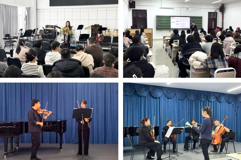10月16日至11月19日,音乐学院先后邀请中央音乐学院岳麟、冯惠美和王晔、我校“天池英才”计划特聘专家肖学俊、中国铜管委员会高子晟、广东爵士音乐学会陈小满等,分别作了题为《从琴弦到心弦——小提琴演奏中的技术突破与情感表达》《海顿四重奏的平衡与智慧——古典主义的对话艺术》《视唱练耳教学漫谈》《中国传统音乐的腔音、音色、节奏、旋法》《中国音乐生的破局之道:从琴房到市场的战略转型》《爵士演唱的中西融合》的专题讲座,涵盖器乐演奏、视唱练耳教学、传统音乐理论、音乐人才培养等方面。