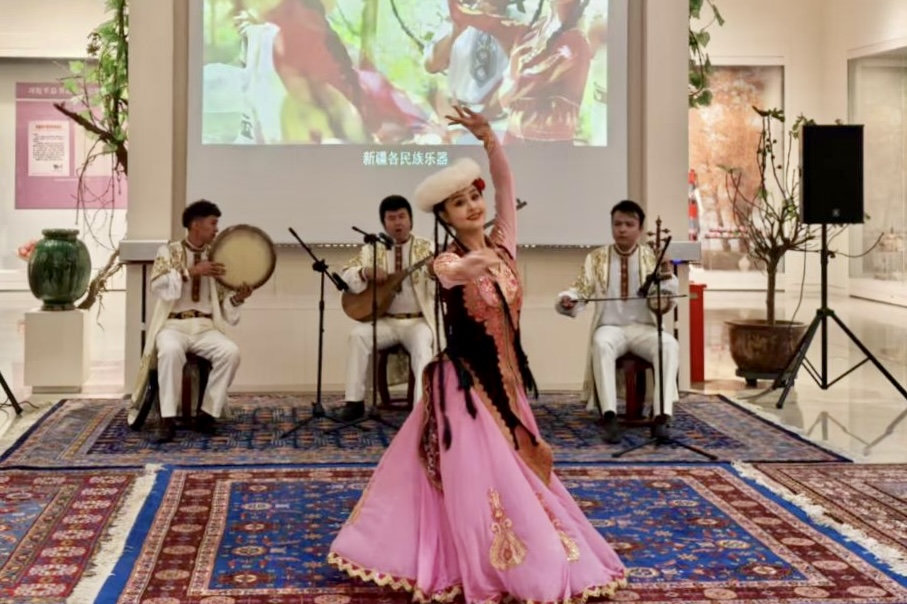 活动现场,我校师生应邀精彩演绎《且比亚特木卡姆》经典段落,呈现了木卡姆艺术的原生风貌与民间音乐的醇厚韵味,参展观众沉浸式感受到了其独特的艺术魅力。