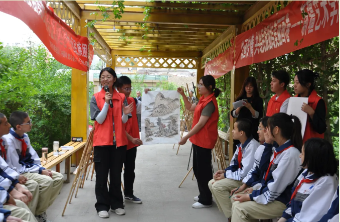 以画传情,共绘民族团结美丽画卷。学校团委组织美术学院师生前往天山区南湾街片区管委会波斯坦巷社区开展了绘画艺术进社区活动。美术学院的志愿者们向辖区各族群众和乌鲁木齐市第十六中学的同学们展示并介绍了扎染、手工衍纸、剪纸、山水画、版画等不同类型的美术作品,带领学生们绘制了具有中华各民族形象的装饰画,不仅满足了辖区居民艺术方面的文化需求,也将中华优秀传统文化带到了群众的身边。