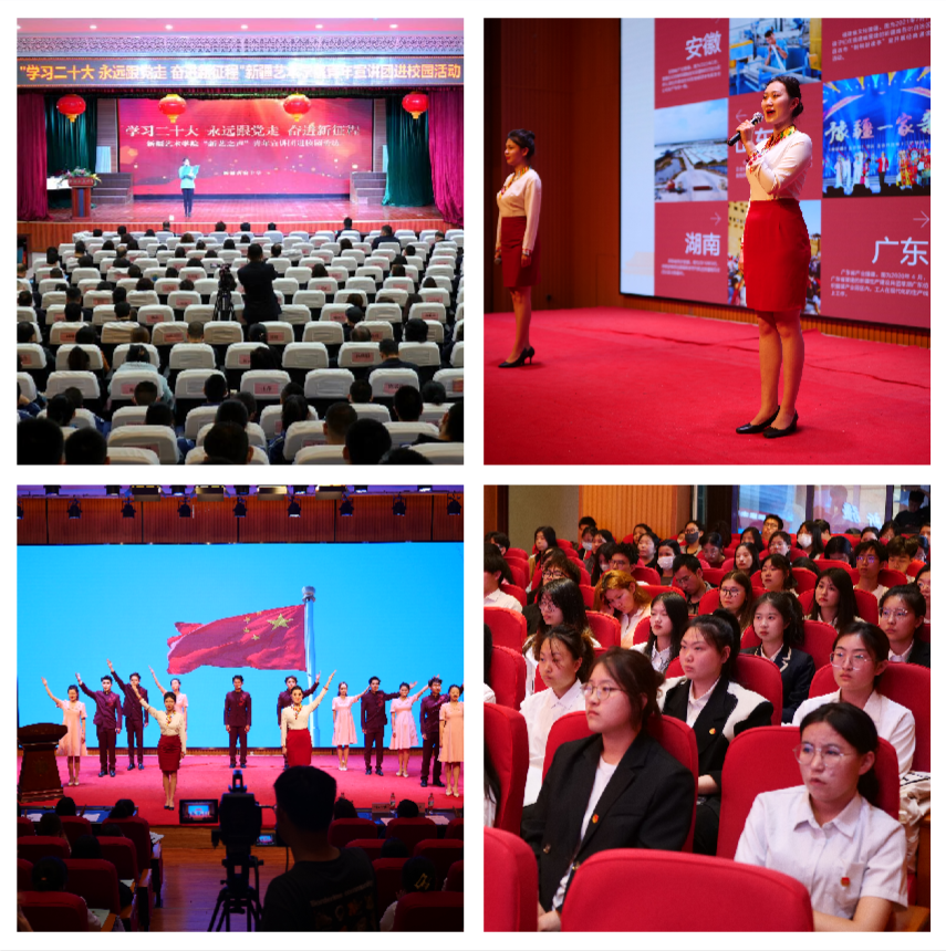 “新艺之声”青年宣讲团,让党的二十大精神“深入人心”。我校“新艺之声”青年宣讲团来到南湾街街道、新疆师范大学、新疆实验中学、八一中学和新投集团天宁公司,结合自身作为“奋进新时代主题成就展”新疆单元的一名小石榴讲解员的故事,围绕“奋进新时代主题成就展”进行成果汇报,展现出了十年来新疆经济社会发展在各方面取得的历史性成就,用声音的力量让党的二十大精神深入人心。