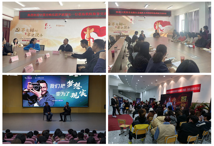 3月22日、4月4日,音乐学院邀请人民音乐出版社总编杜永寿一行、中国交响乐团副团长尹波一行与学院师生就教学教材建设、教育教学、科研创作情况以及中国交响乐团建团历史发展现状、职业乐团对人才的需求、学生职业发展规划等方面进行了交流座谈。专家与教师们深入探讨关于教学科研与国家发展同频共振,深入推进文化润疆等课题,同时,搭建了学生乐团与职业乐团音乐家之间的固定沟通平台。