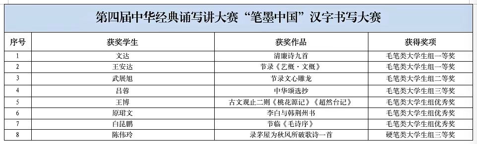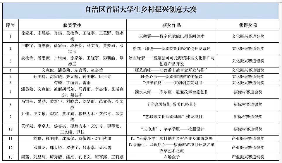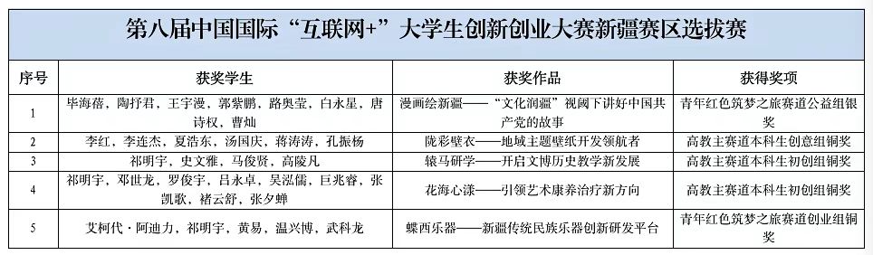 近日,我校师生在多项赛事中荣获佳绩。在由教育部、国家语委主办的第四届中华经典诵写讲大赛“笔墨中国”汉字书写大赛及“印记中国”师生篆刻大赛中,书法学院学生文达、王安达、张丁阳等9人分获大学生组一、二、三等奖及优秀奖。在由自治区教育厅、农业农村厅等单位联合主办的自治区首届大学生乡村振兴创意大赛中,我校13个项目获奖,其中,金奖3项、银奖6项、铜奖4项,学校获得“优秀组织奖”,5名教师获得“优秀指导教师”、1名教师获得“优秀工作者”。在第八届中国国际“互联网+”大学生创新创业大赛新疆赛区选拔赛中,我校获得银奖1项、铜奖3项。