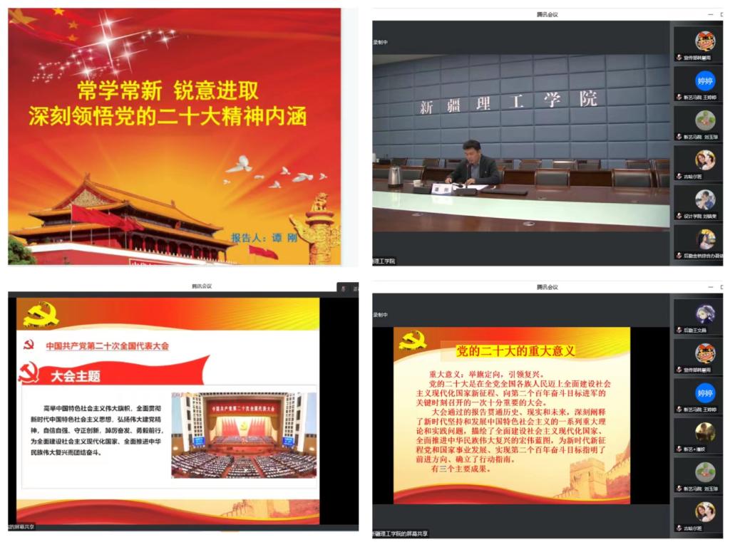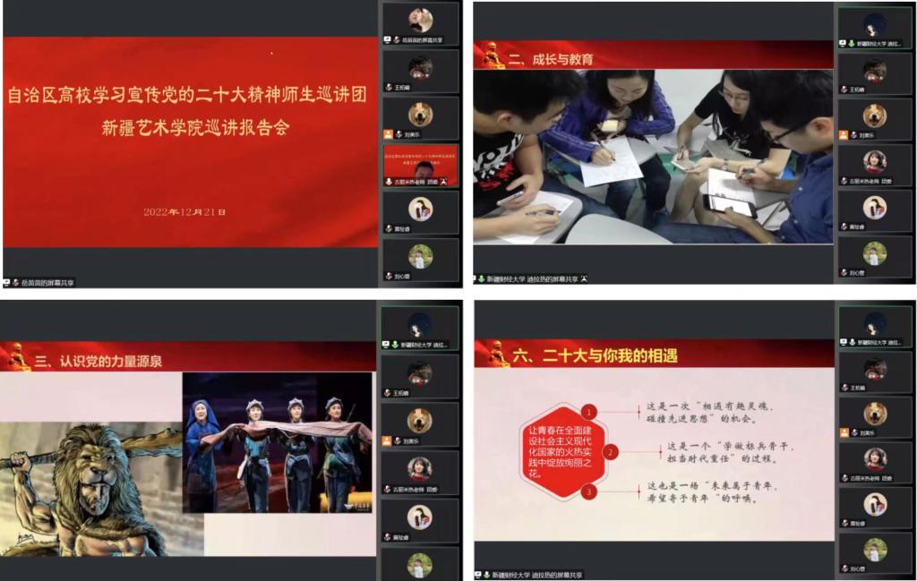 自治区高校学习宣传党的二十大精神师生巡讲团成员、新疆理工学院党委副书记谭刚教授、新疆财经大学学生代表迪拉热·甫拉提分别以《常学常新 锐意进取 深刻领悟党的二十大精神内涵》《党的二十大与我的人生路》为题进行了宣讲。谭刚教授从党的二十大的主题、过去5年的工作和新时代十年的伟大变革、开辟马克思主义中国化时代化新境界、以中国式现代化全面推进中华民族伟大复兴等七个方面深入讲解了党的二十大精神。迪拉热·甫拉提以自己的成长之路、“一代人有一代人的长征,一代人有一代人的担当”等多个方面讲解了自己对党的二十大精神的学习体会。