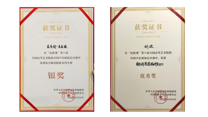 “民族魂”第八届全国高等艺术院校中国声乐展演总决赛我校获奖证书