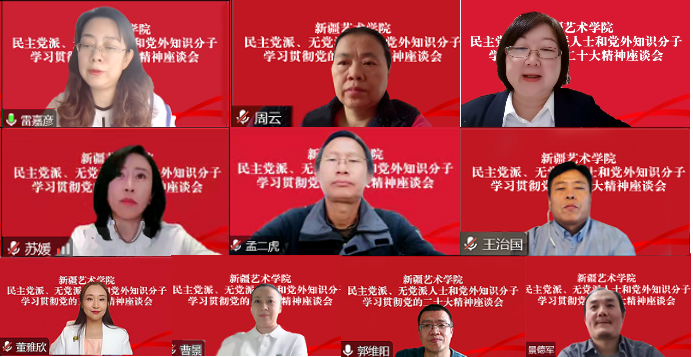 座谈会上,学校民主党派、无党派人士和党外知识分子代表交流了学习体会。会议指出,学习宣传贯彻党的二十大精神是当前和今后一个时期的首要政治任务,学校民主党派、无党派人士和党外知识分子要按照自治区党委和学校党委的安排部署,认真学习领会党的二十大精神,坚持把学习贯彻党的二十大精神与习近平总书记视察新疆重要讲话重要指示精神结合起来,认真落实立德树人根本任务,通过教育教学、“三进两联一交友”、开展文化润疆创作研究等载体向师生进行宣讲,加强铸牢中华民族共同体意识宣传教育,切实推动党的二十大精神进课堂、进头脑,为学校高质量发展贡献智慧和力量。