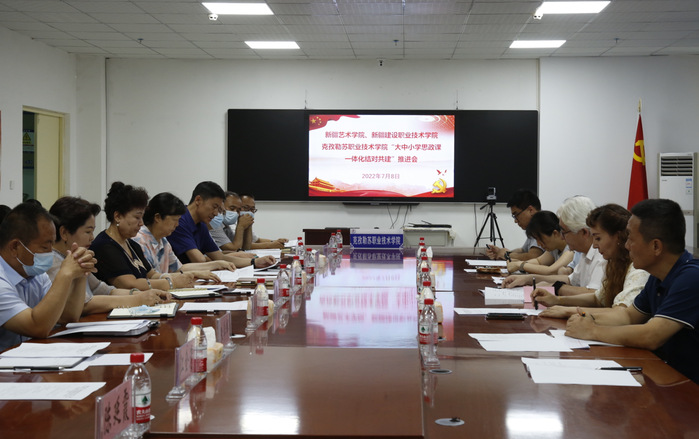 7月8日,由新疆艺术学院牵头组织,新疆建设职业技术学院、克州党委教育工委、克孜勒苏职业技术学院和克州州直六所中小学共同参加的“大中小学思政课一体化结对共建”推进会在克孜勒苏职业技术学院召开。新疆艺术学院党委副书记 、院长莫合德尔·亚森,克孜勒苏柯尔克孜自治州人民政府副州长哈力旦·吐尔逊及克州党委教育工委领导、各参会单位负责人、专家学者共同参加了推进会。
