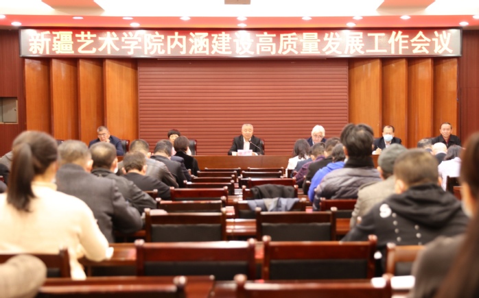 章立新书记从硬件和软件两个方面对学校内涵建设高质量发展进行了分析并提出工作要求。他在讲话中说,近年来,学校办学条件明显改善,新校区建设稳步推进,学校发展建设取得长足进步。他强调,学校内涵建设高质量发展软件建设需做好以下六点:一是加快实施人才引进计划。柔性引进和刚性引进相结合,修订完善各类人才队伍建设管理制度;二是深入推进文化润疆工程。推进文化润疆创作研究院建设,继续增加师生创作实习实践基地,紧密结合实践教学、加强与自治区文联、社科联等厅局单位的联系;三是继续提升干部教师能力素质。采取走出去、引进来相结合,进行教师能力素质培训提升、建设教师教学能力素质测评体系,优化优秀人才教师激励措施;四是意识形态领域工作持之以恒、毫不松懈;五是坚持依法治疆、依法治校、依法依规严格管理;六是加强干部作风建设,加强干部学习,提升能力素质水平,严格遵守六大纪律。
