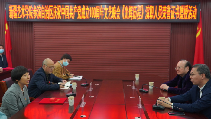 10月15日上午,自治区党委宣传部副部长任彦宾、自治区党委宣传部文艺处处长张太保、新疆广播电视台艺术总监曾健等一行,为我校参演自治区庆祝中国共产党成立100周年文艺晚会的300余名演职人员赠授荣誉证书。学校党委领导班子成员樊文平、周达疆及相关部门负责人和学生代表参加了赠授活动。