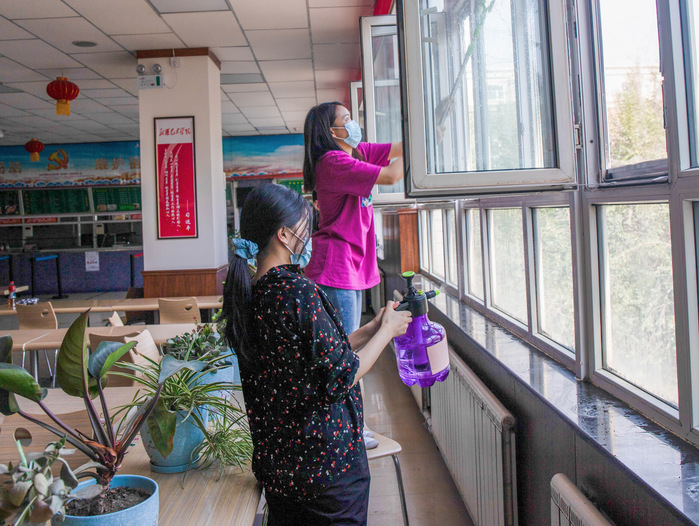 学生志愿者清洁食堂窗户