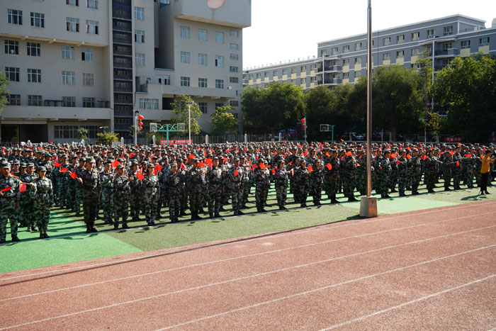 最后,全体师生挥舞起手中国旗,共同唱响《我和我的祖国》,2019级新生军训正式拉开帷幕。