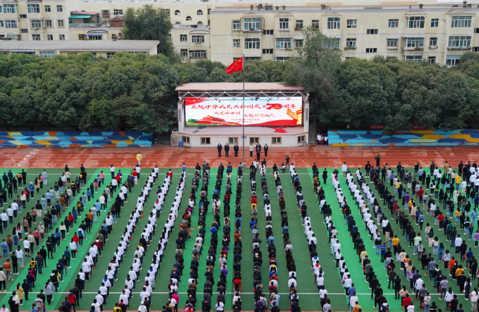 金秋十月,丹桂飘香,我们迎来了祖国母亲的70岁生日。早上10点,学校在运动场举行了“热烈庆祝中华人民共和国成立70周年”主题升旗仪式。学校党委书记章立新、党委领导班子成员樊文平、吾甫尔·如苏力、全立新、刘洪波、蒋方珍、斯尔哈孜·布兰拜与师生代表参加了升旗仪式。