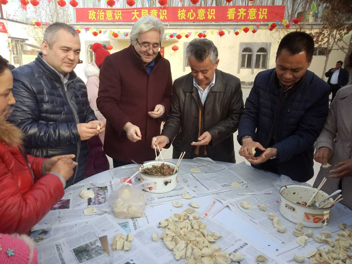 学院党委副书记、院长莫合德尔•亚森一行与阿其克乡10村村民们一起包饺子