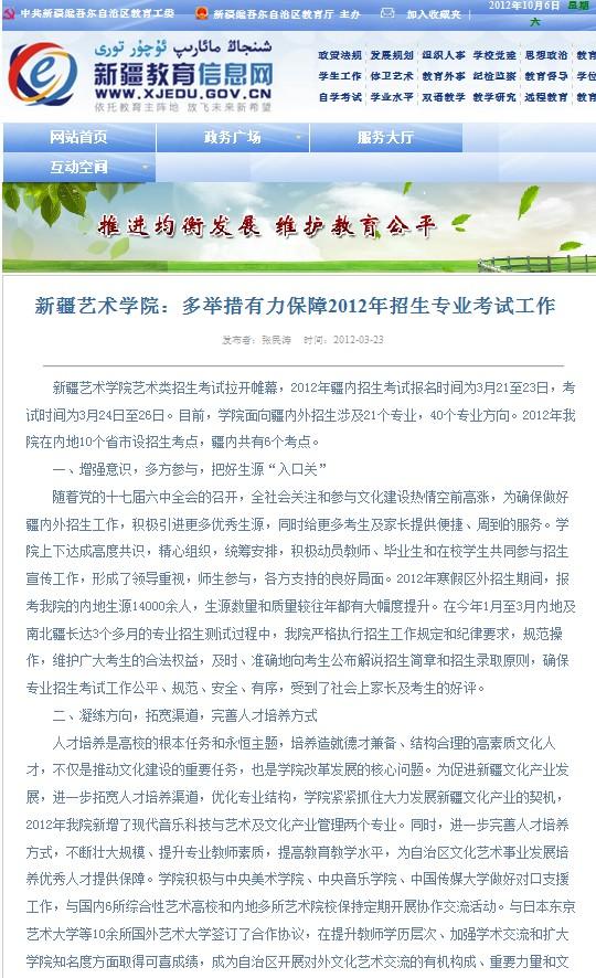 【新闻报道】新疆艺术学院艺术类招生考试拉开帷幕,2012年疆内招生考试报名时间为3月21至23日,考试时间为3月24日至26日。目前,学院面向疆内外招生涉及21个专业,40个专业方向。2012年我院在内地10个省市设招生考点,疆内共有6个考点。