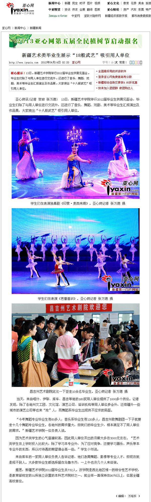【新闻报道】 亚心网讯(记者 贺岩 张万德) 13日,新疆艺术学院举行2012届毕业生供需见面会,毕业生们除了与用人单位进行交流外,还进行了音乐、舞蹈、戏剧、美术等毕业生汇报演出及作品展,大家使出“十八般武艺”吸引用人单位。