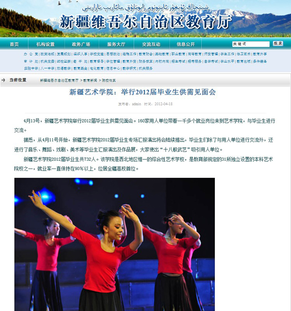 据悉,从4月11号开始,新疆艺术学院2012届毕业生专场汇报演出将会陆续推出,毕业生们除了与用人单位进行交流外,还进行了音乐、舞蹈、戏剧、美术等毕业生汇报演出及作品展,大家使出“十八般武艺”吸引用人单位。