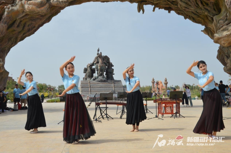 7月10日,新疆艺术学院实践团在岳普湖县达瓦昆沙漠旅游风景区演出。 曾颖敏摄