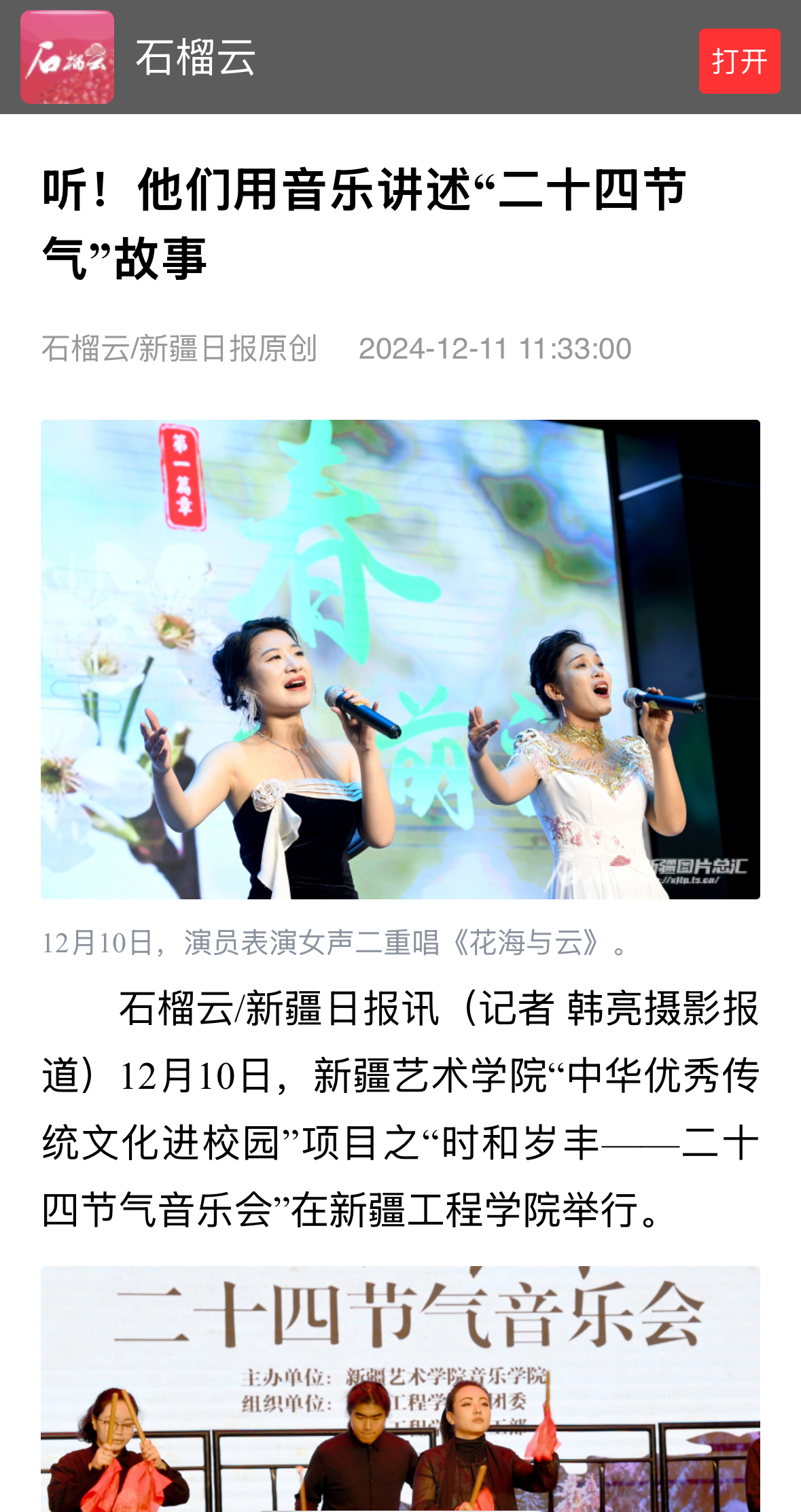 12月11日,石榴云/新疆日报以《听!他们用音乐讲述“二十四节气”故事》为题对我校进行报道。