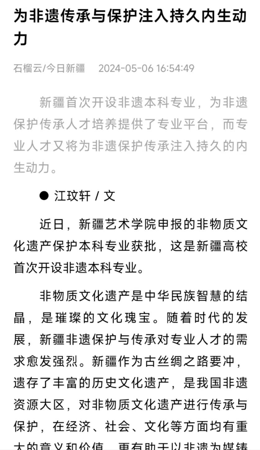 新疆首次开设非遗本科专业,为非遗保护传承人才培养提供了专业平台,而专业人才又将为非遗保护传承注入持久的内生动力。