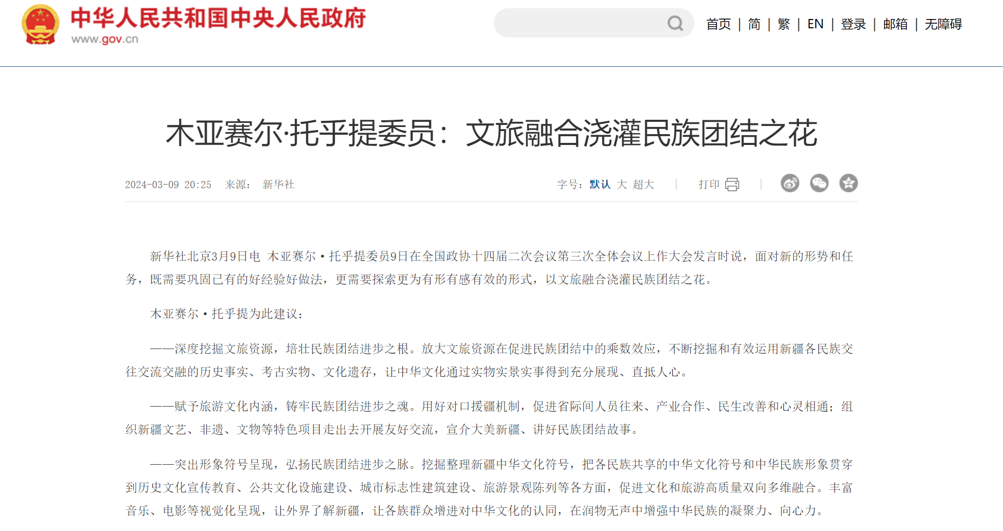 木亚赛尔·托乎提委员:文旅融合浇灌民族团结之花__中国政府网 (www.gov.cn)