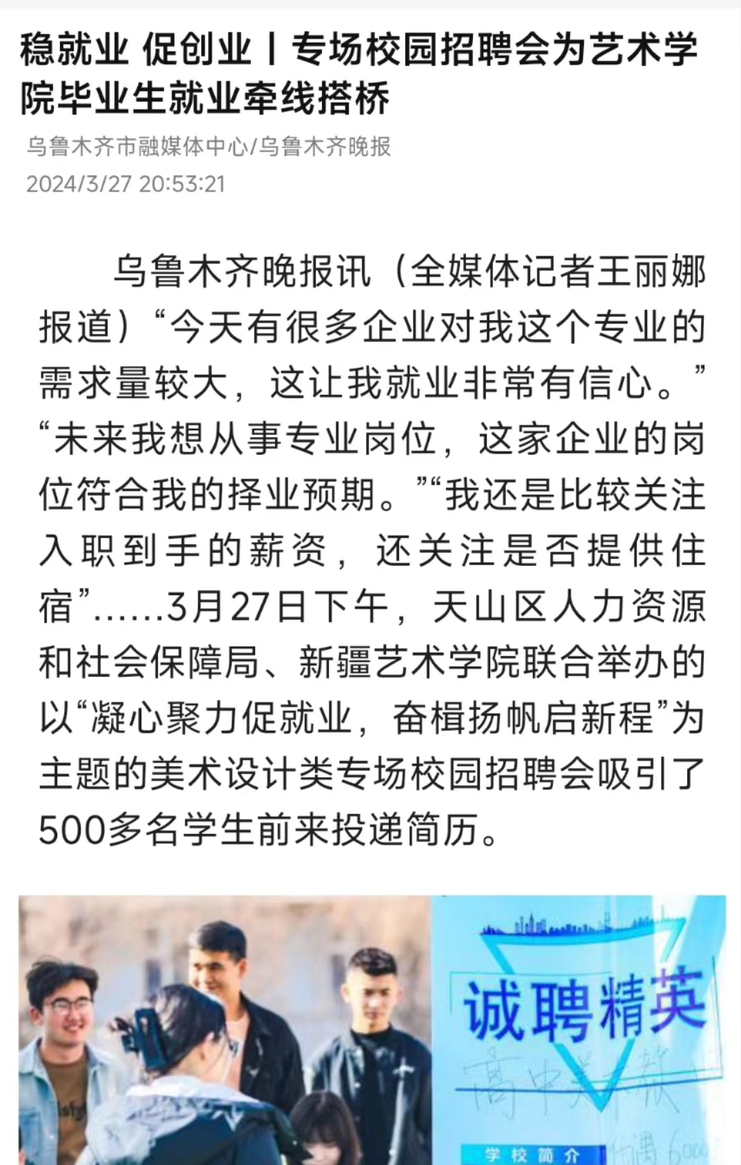 3月27日,乌鲁木齐市融媒体中心乌鲁木齐晚报以《稳就业 促创业|专场校园招聘会为艺术学院毕业生就业牵线搭桥》为题对我校进行报道。