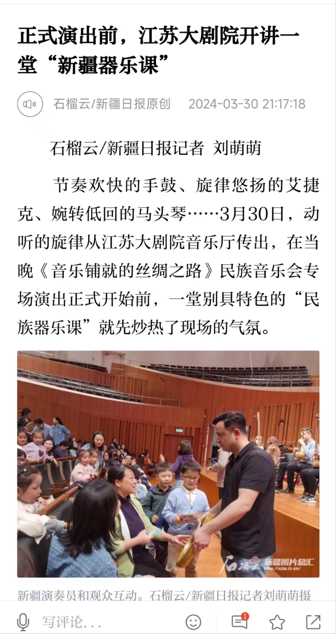 3月31日,石榴云/新疆日报以《共奏丝路乐章 民族音乐会< 音乐铺就的丝绸之路>惊艳亮相南京》为题对我校进行报道。