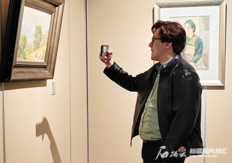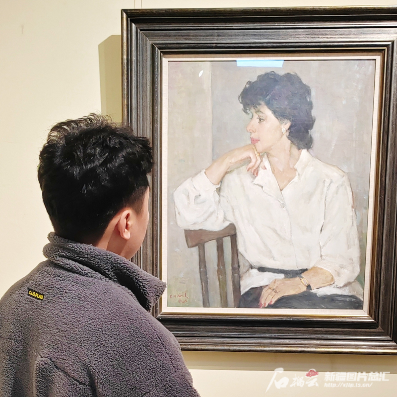 展厅里四处流连着观展的艺术爱好者及大学生们,大家不仅仔细欣赏,还时不时的就某个作品讨论一番。新疆艺术学院美术学院正在读研一的王亚腾与同学站在几幅人物作品前,反复观看,“这幅人物面部的明暗处理非常微妙,对造型把控也特别精准,人物神韵流动在画布上。欣赏作品,仿佛画中的人物就站在自己面前。”像王亚腾这样赞叹展览作品的大学生比比皆是,大家不但在欣赏作品,更多的是琢磨画面中的色彩如何巧妙表现明暗对比,又做到不动声色的和谐统一。