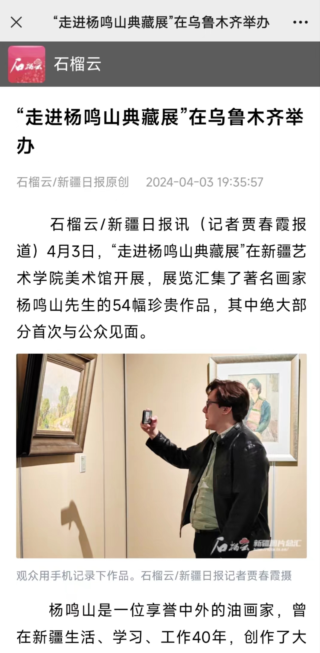 石榴云/新疆日报讯(记者贾春霞报道)4月3日,“走进杨鸣山典藏展”在新疆艺术学院美术馆开展,展览汇集了著名画家杨鸣山先生的54幅珍贵作品,其中绝大部分首次与公众见面。