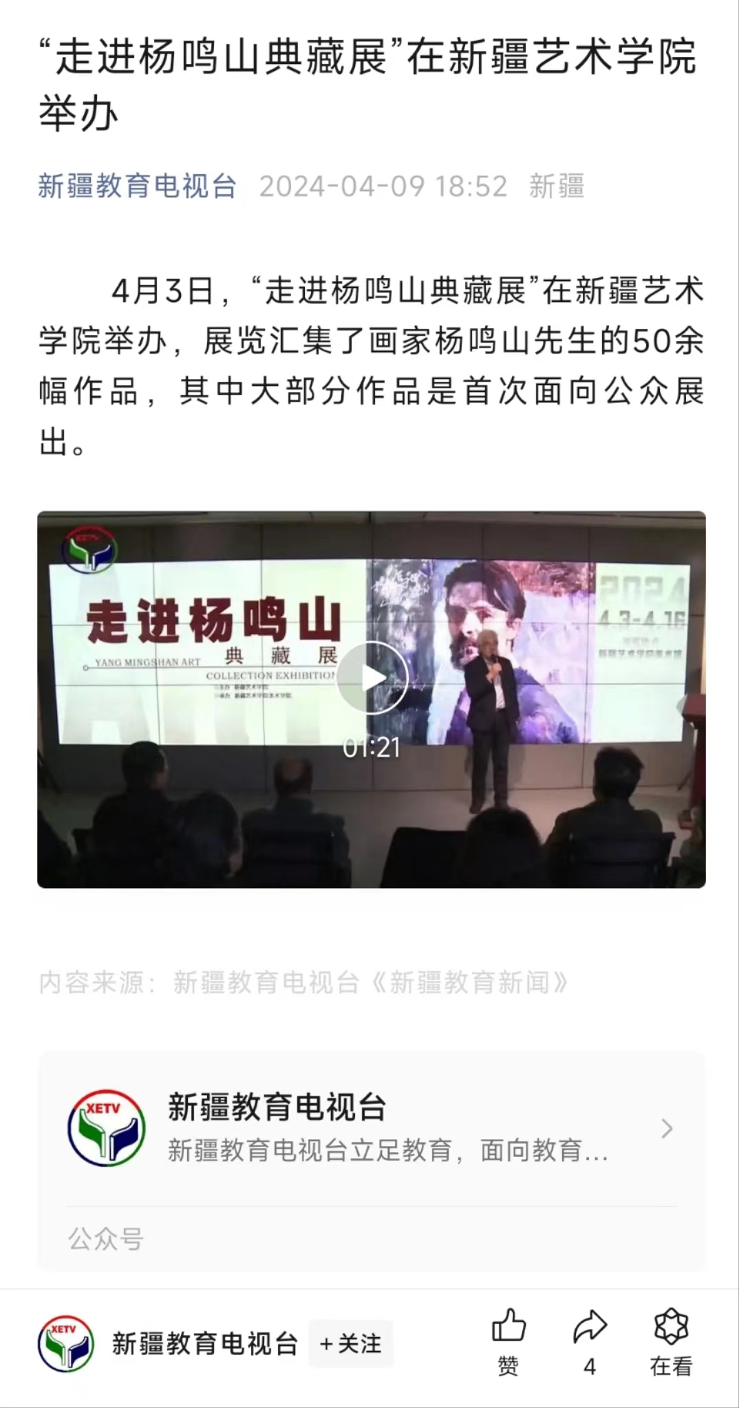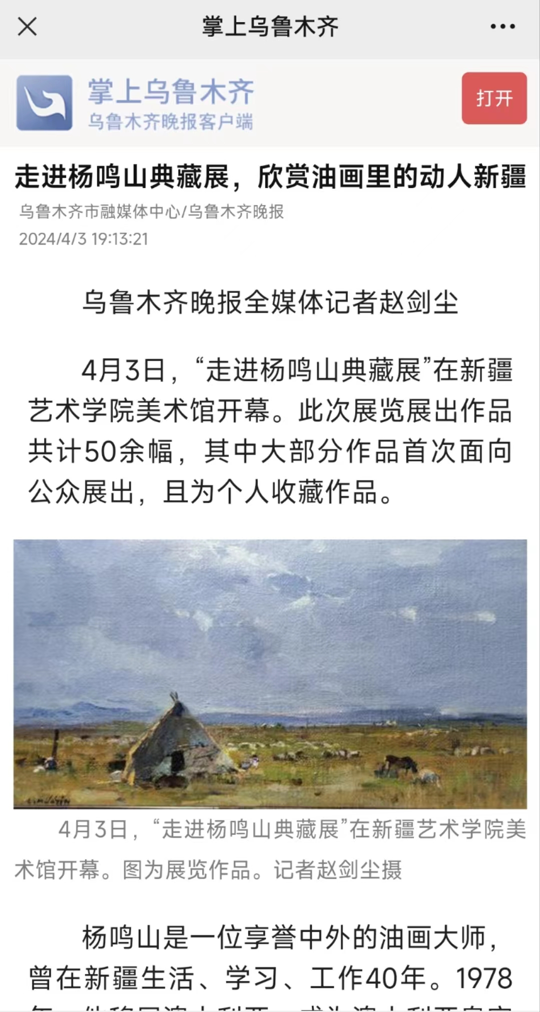 4月3日,“走进杨鸣山典藏展”在新疆艺术学院举办,展览汇集了画家杨鸣山先生的50余幅作品,其中大部分作品是首次面向公众展出。