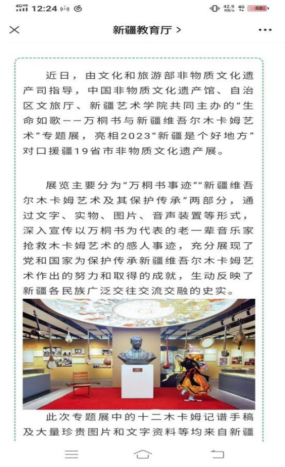近日,由文化和旅游部非物质文化遗产司指导,中国非物质文化遗产馆、自治区文旅厅、新疆艺术学院共同主办的“生命如歌——万桐书与新疆维吾尔木卡姆艺术”专题展,亮相2023“新疆是个好地方”对口援疆19省市非物质文化遗产展。