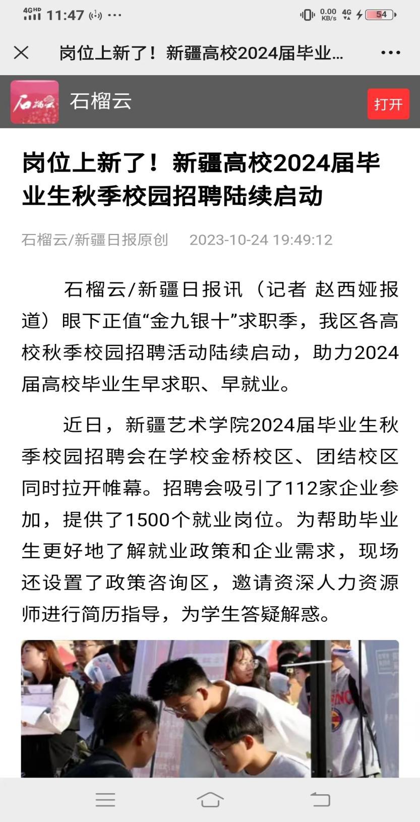 10月24日 石榴云/新疆日报以《岗位上新了!新疆高校2024届毕业生秋季校园招聘陆续启动》为题对我校进行报道。
