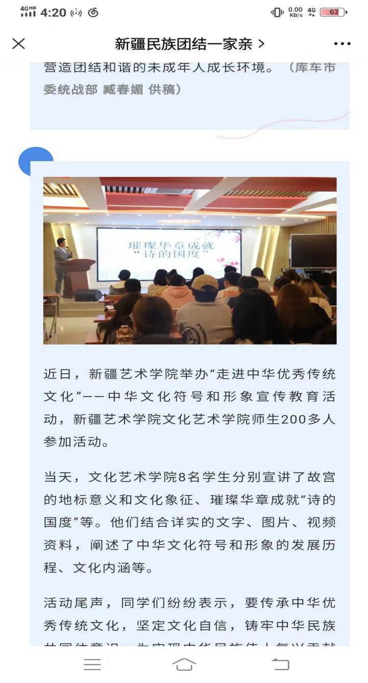 近日,新疆艺术学院举办“走进中华优秀传统文化”——中华文化符号和形象宣传教育活动,新疆艺术学院文化艺术学院师生200多人参加活动。当天,文化艺术学院8名学生分别宣讲了故宫的地标意义和文化象征、璀璨华章成就“诗的国度”等。他们结合详实的文字、图片、视频资料,阐述了中华文化符号和形象的发展历程、文化内涵等。活动尾声,同学们纷纷表示,要传承中华优秀传统文化,坚定文化自信,铸牢中华民族共同体意识,为实现中华民族伟大复兴贡献青春力量。(新疆艺术学院 供稿)