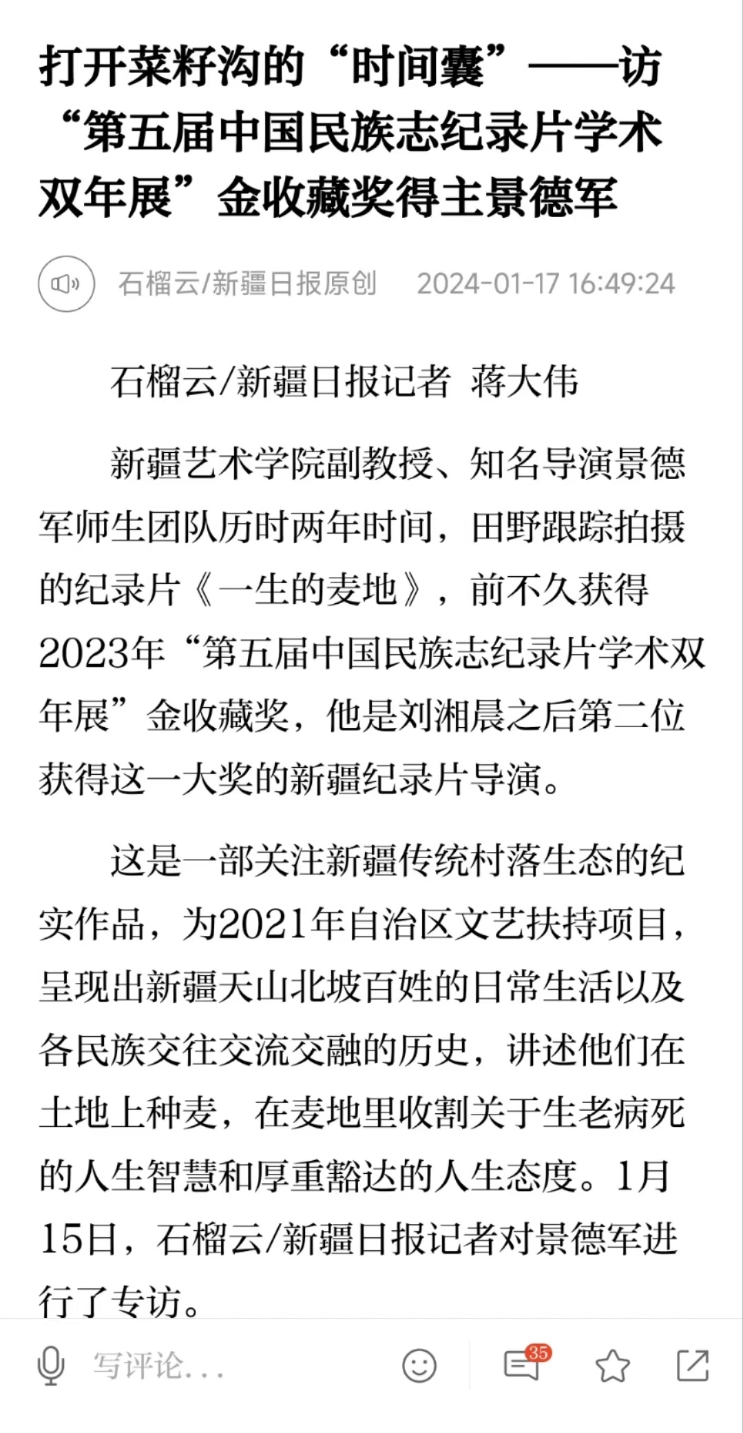 新疆艺术学院副教授、知名导演景德军师生团队历时两年时间,田野跟踪拍摄的纪录片《一生的麦地》,前不久获得2023年“第五届中国民族志纪录片学术双年展”金收藏奖,他是刘湘晨之后第二位获得这一大奖的新疆纪录片导演。