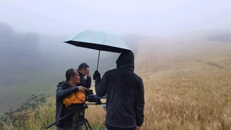 新疆纪录片导演景德军师生团队在木垒哈萨克自治县英格堡乡菜籽沟拍摄纪录片《一生的麦地》。景德军供图。