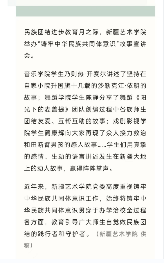 近年来,新疆艺术学院党委高度重视铸牢中华民族共同体意识工作,始终将铸牢中华民族共同体意识贯穿于办学治校全过程各方面,教育引导广大师生自觉做民族团结的践行者和守护者。
