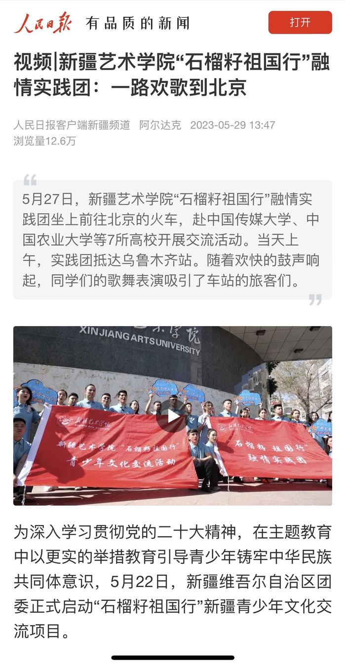 5月29日,人民日报客户端新疆频道以《报道视频∣新疆艺术学院“石榴籽祖国行”融情实践团:一路欢歌到北京》为题对我校进行报道。