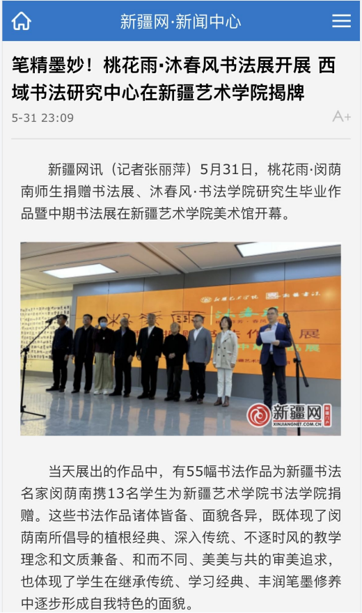 5月31日,新疆网以《笔精墨妙!桃花雨·沐春风书法展开展 西域书法研究中心在新疆艺术学院揭牌》为题对我校进行报道。