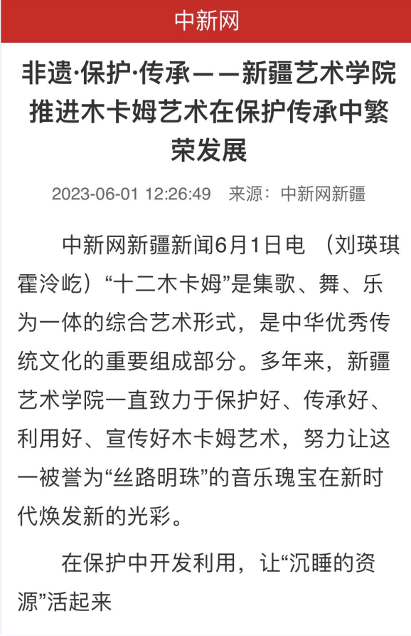 6月1日,中新网新疆以《非遗·保护·传承——新疆艺术学院推进木卡姆艺术在保护传承中繁荣发展》为题对我校进行报道。