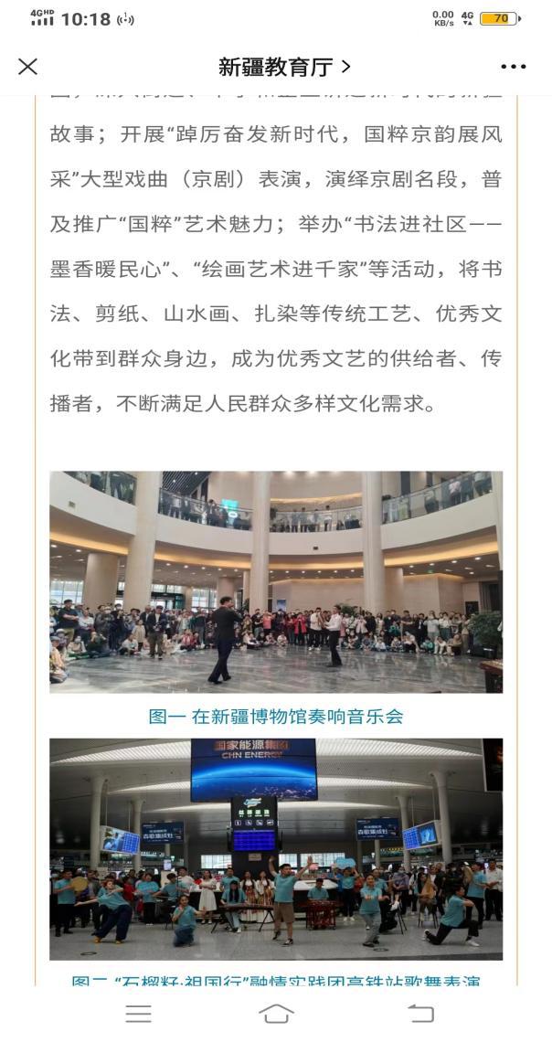 二是机场高铁快闪演绎新疆歌舞魅力。依托“石榴籽·祖国行”新疆青少年交流项目,组建融情实践团前往中央美术学院、中央音乐学院等北京7所高校,通过座谈宣讲、艺术交流、志愿公益、巴扎展示、主题教育等方面开展交流融情活动。沿途在机场、高铁站、候车厅、列车厢等公共场域以歌舞快闪形式展示民族舞蹈,演奏民族乐器,将新疆传统歌舞带给全国各地的游客,展现大美新疆的艺术魅力,尽显新艺学子的青春风采。