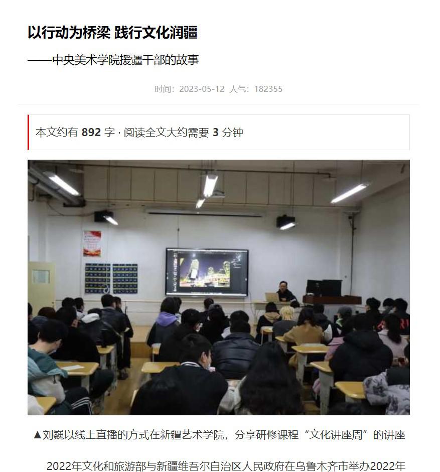 5月12日,党建头条以《以行动为桥梁 践行文化润疆——中央美术学院援疆干部的故事》为题对我校进行报道。